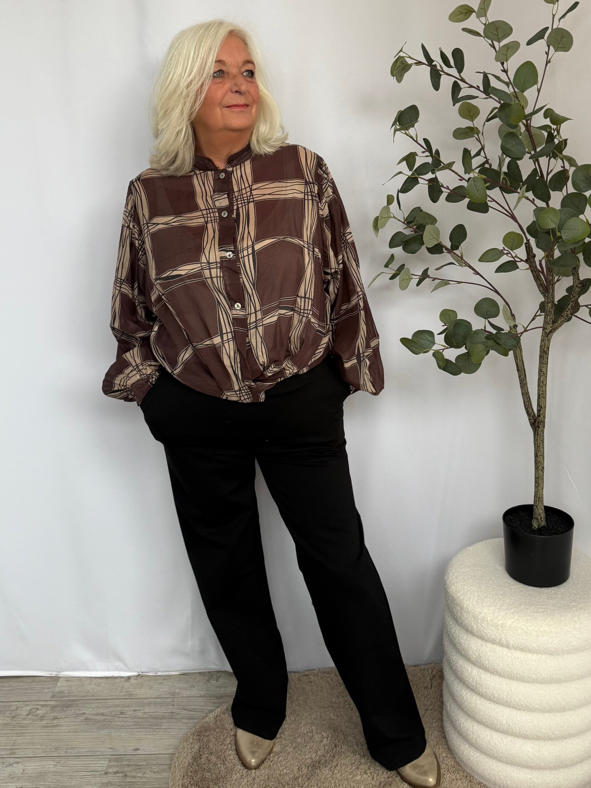 Deze blouse van luchtig katoen heeft een subtiel vakstructuur en een stijlvolle, vrouwelijke twist aan de onderkant. De vaste gedraaide knoop geeft het effect van een nonchalante voorknoop zonder dat je hem zelf hoeft te strikken.