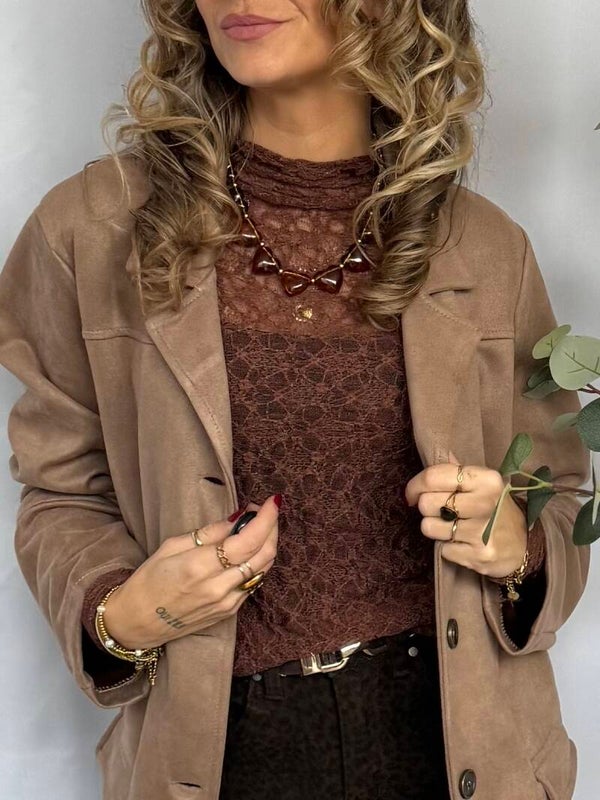 Vrouwelijke bruine top met elegante kanten details. De stof is zacht, rekbaar en sluit mooi aan op het lichaam. Dankzij de mix van katoen en elastan voelt de top comfortabel aan en heeft hij een luxe uitstraling.