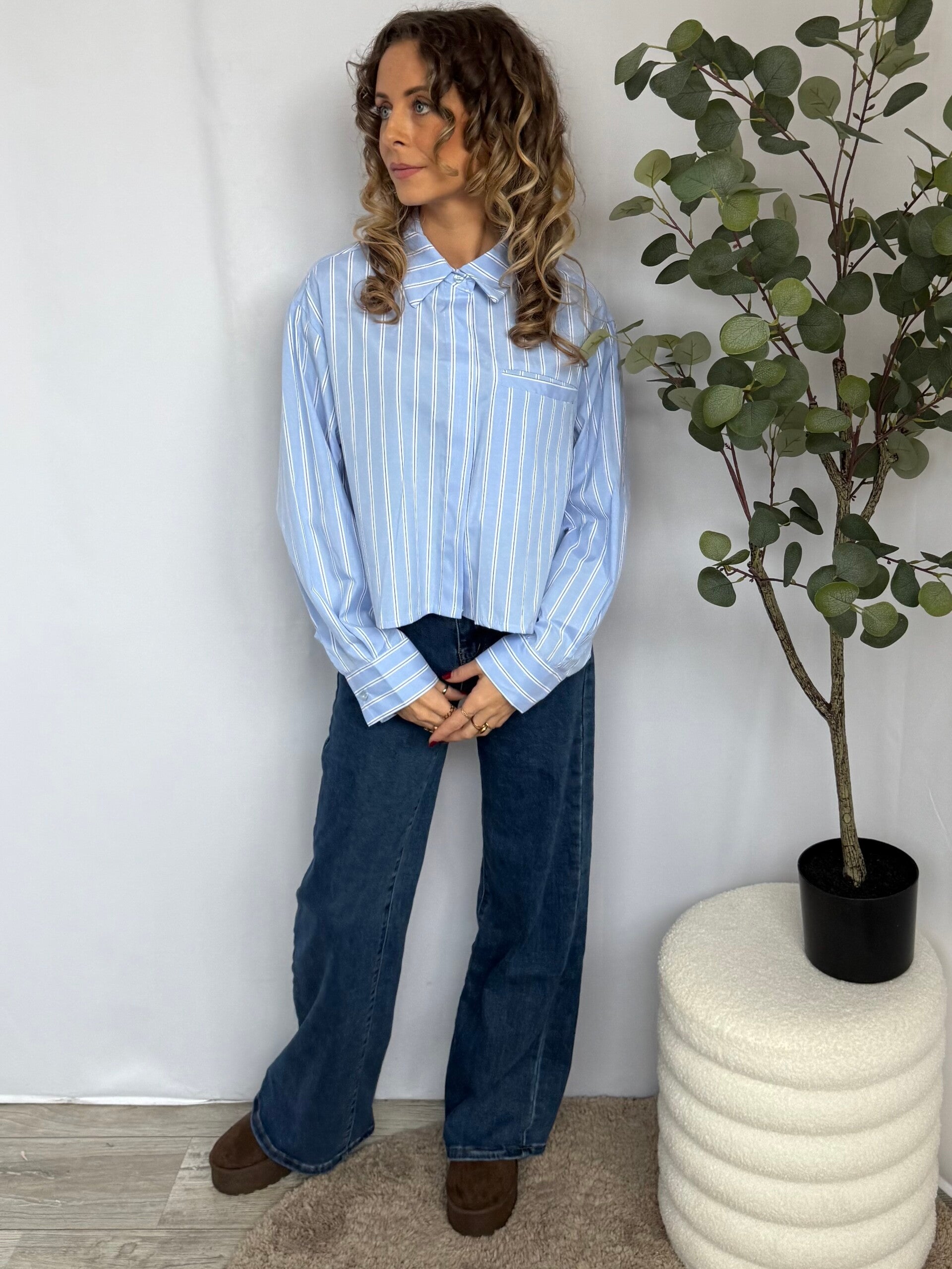 Frisse lichtblauwe blouse met een subtiel wit streeppatroon. Het katoenen materiaal voelt luchtig en draagt comfortabel, terwijl de rechte fit met brede manchetten zorgt voor een moderne, vrouwelijke look. Mooi op een jeans voor alledaags of juist classy onder een blazer.