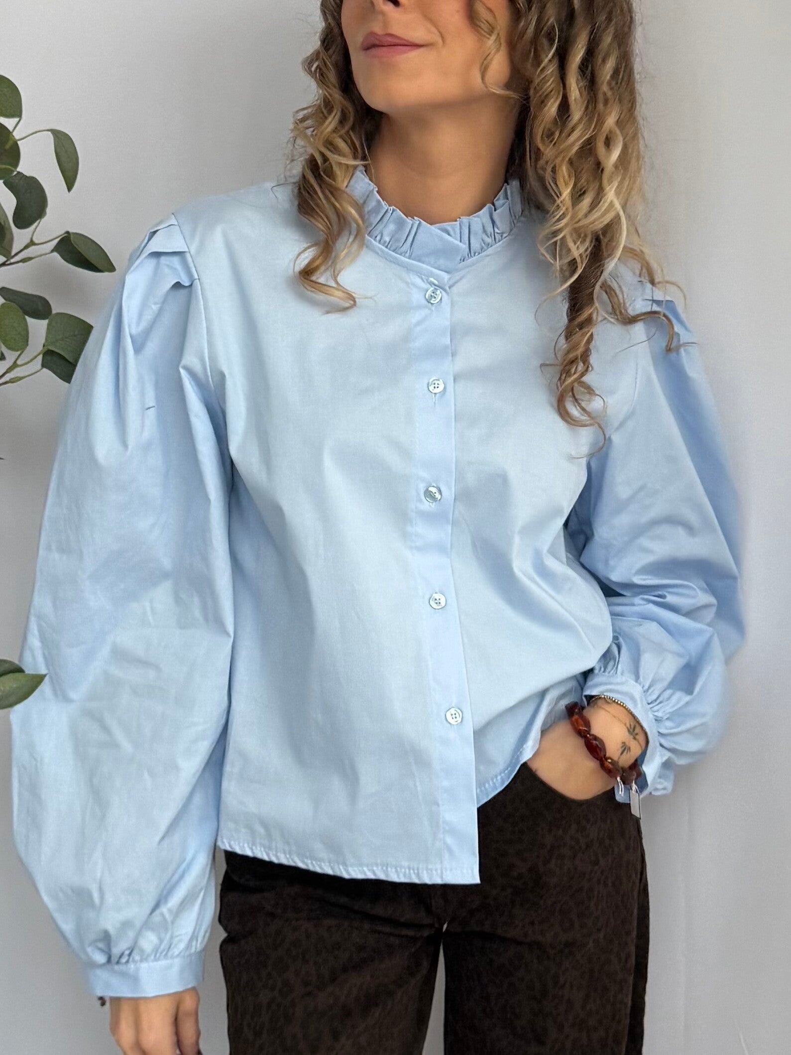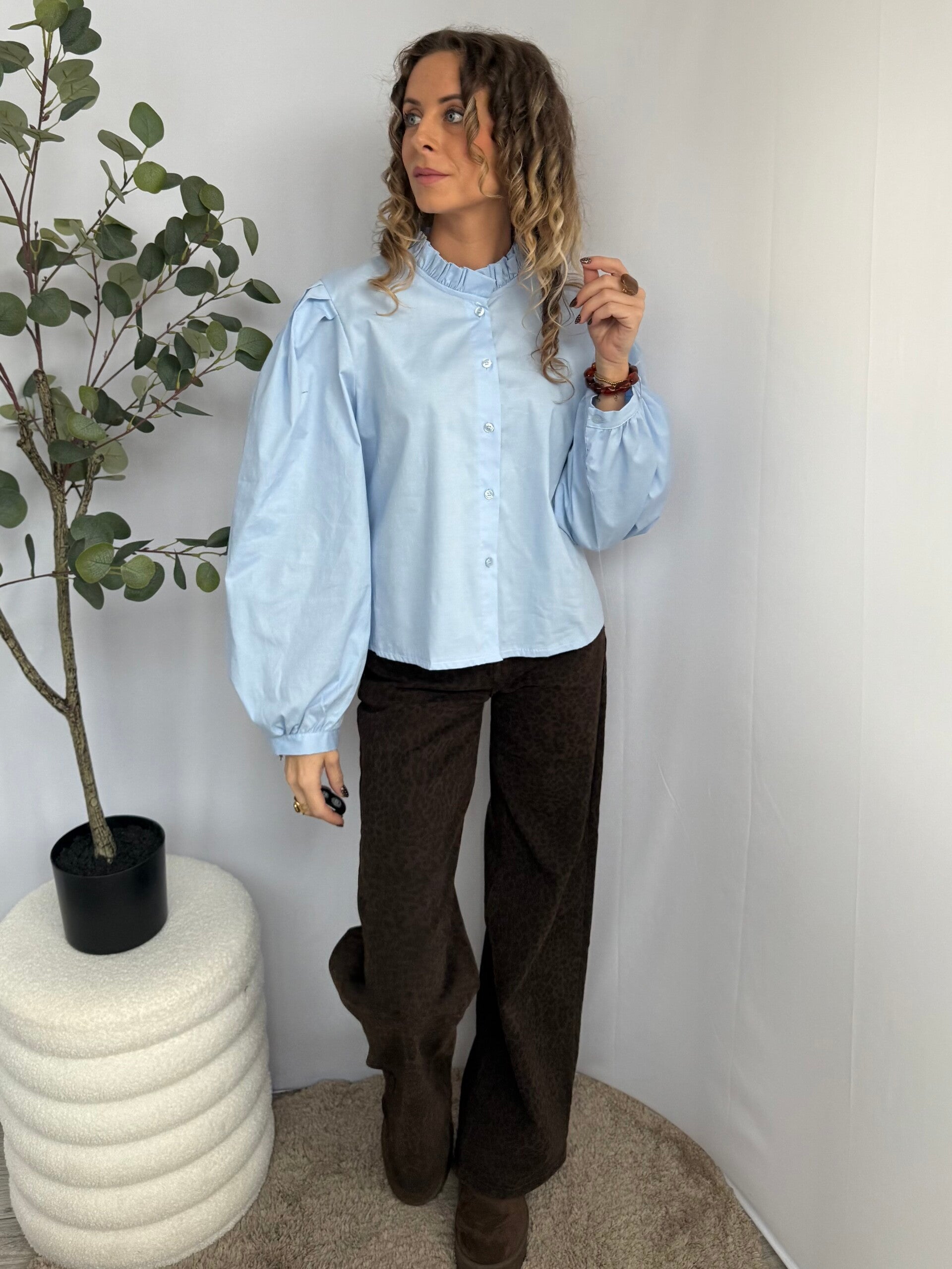 Luchtige blouse in een frisse lichtblauwe kleur met een subtiel kraagje met ruches. De pofmouwen en lichte glans geven de blouse een vrouwelijke, elegante uitstraling. Mooi om zo te dragen, of te combineren met een gilet of trui voor een gelaagde herfstlook!