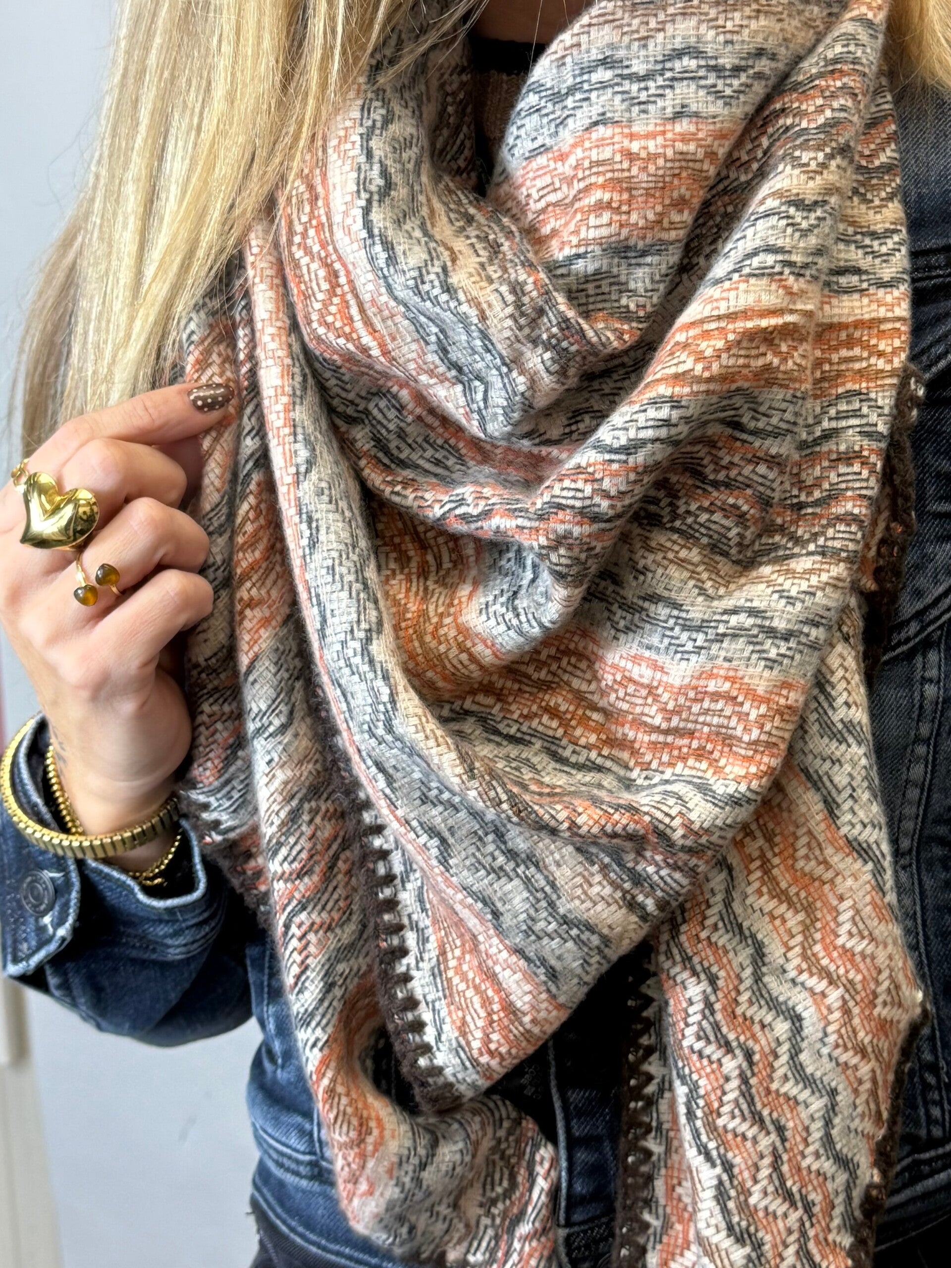 Deze sjaal is gemaakt van een luxe mix van viscose en wol, wat zorgt voor een heerlijk zacht en warm draagcomfort. Je kunt hem leuk van 2 kanten dragen! Het materiaal voelt soepel en comfortabel aan op de huid en geeft elke outfit een elegante, tijdloze uitstraling.