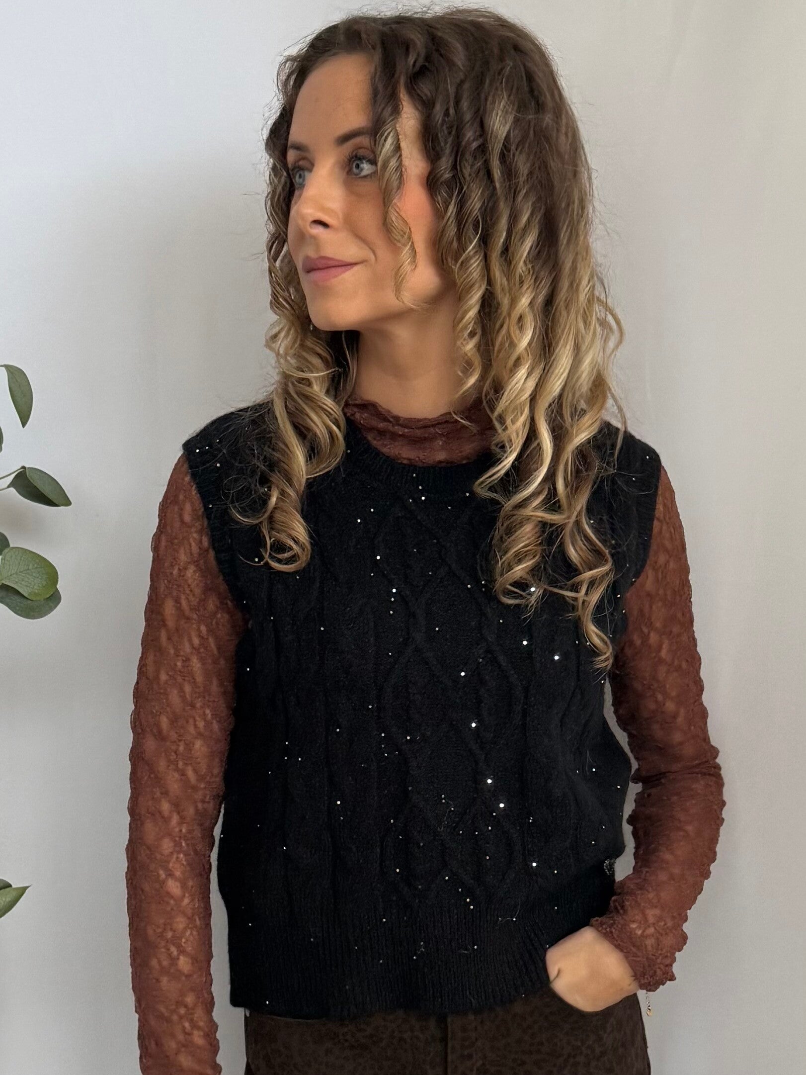 Gebreid gilet met een subtiele glitters en fijne boorden aan de voorzijde. De stof voelt zacht en comfortabel aan, met een lichte stretch die mooi aansluit. Perfect om over een blouse of trui te dragen voor een stijlvolle, glinsterende touch aan je outfit.