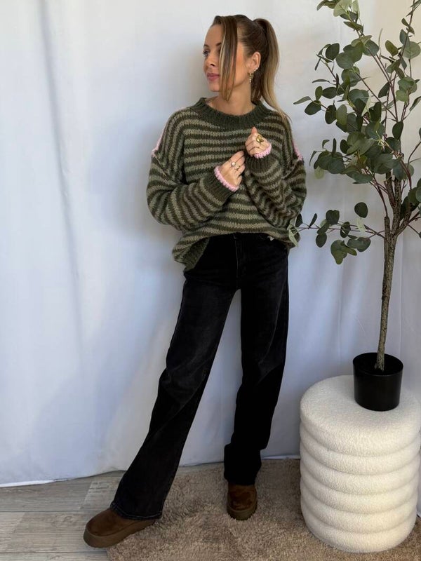 Heerlijk zachte knit met een stoer gestreept patroon en subtiele fluffy structuur. De trui voelt warm aan zonder zwaar te zijn, en valt soepel voor een comfy fit. De contrasterende roze details aan de schouders geven een speels accent, perfect voor casual dagen met een trendy twist.