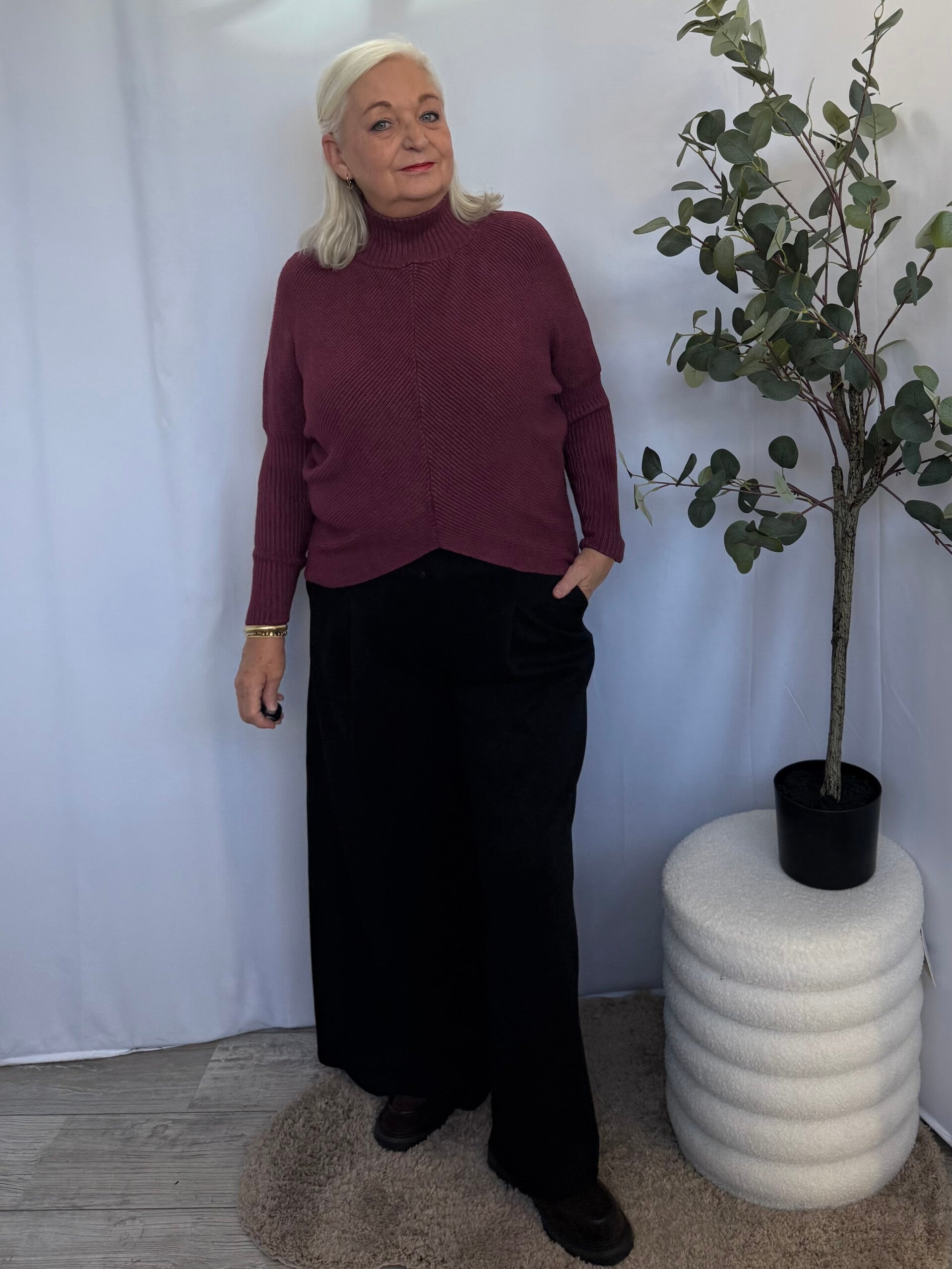 Zachte ribgebreide trui met een comfortabele col en een losvallende fit. De viscosemix voelt soepel en glad aan op de huid, terwijl de diagonale ribstructuur zorgt voor een stijlvolle, flatterende look.