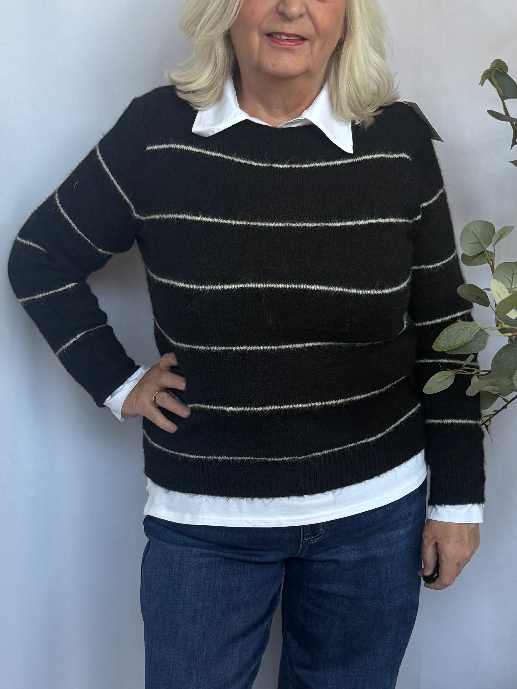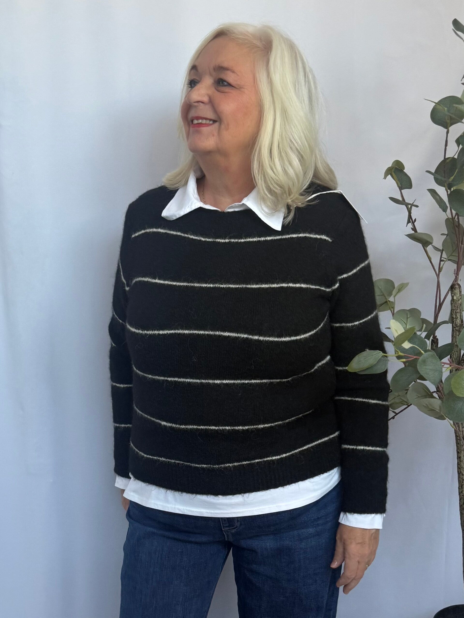 Een heerlijk zachte trui met een subtiele streep en fluffy finish. De wol- en mohairmix geeft een warme, luchtige structuur die niet prikt, terwijl de elastaan zorgt voor een comfortabele stretch.