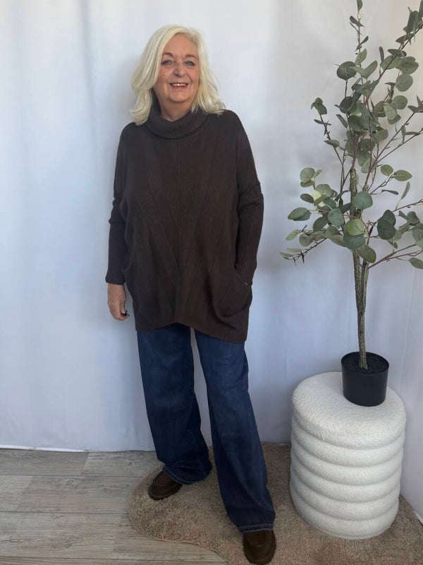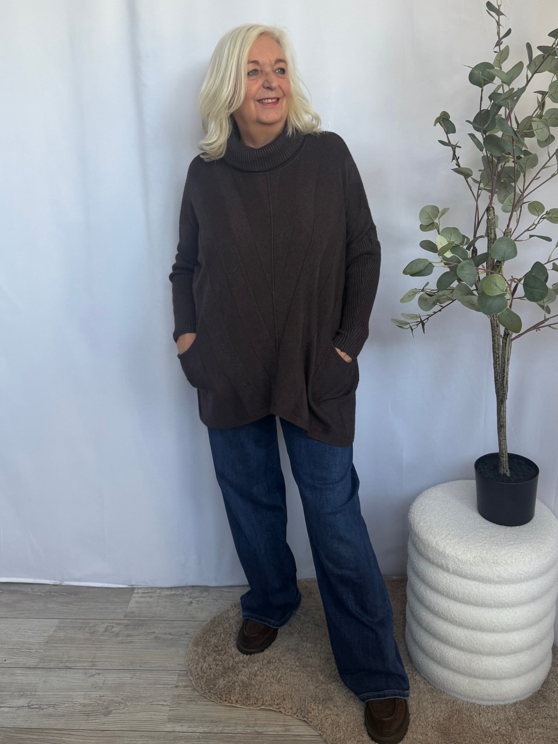 Zachte, comfortabele coltrui met een subtiel patroon in het breisel en twee steekzakken aan de voorkant. De viscoseblend voelt soepel en warm aan, zonder te zwaar te vallen. Perfect voor een casual maar stijlvolle look, ideaal op een jeans of leren broek.