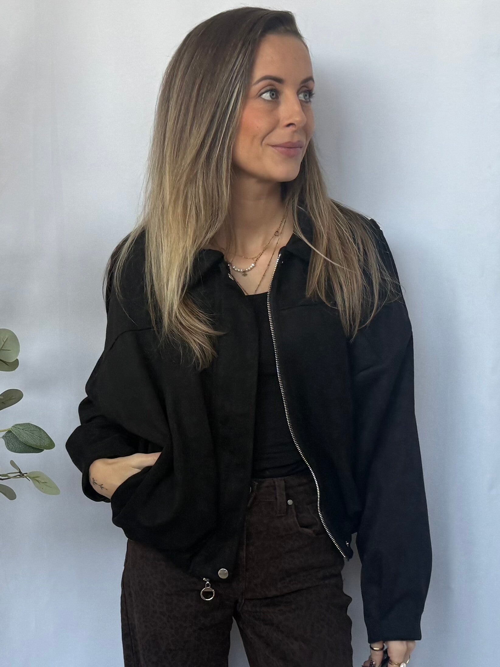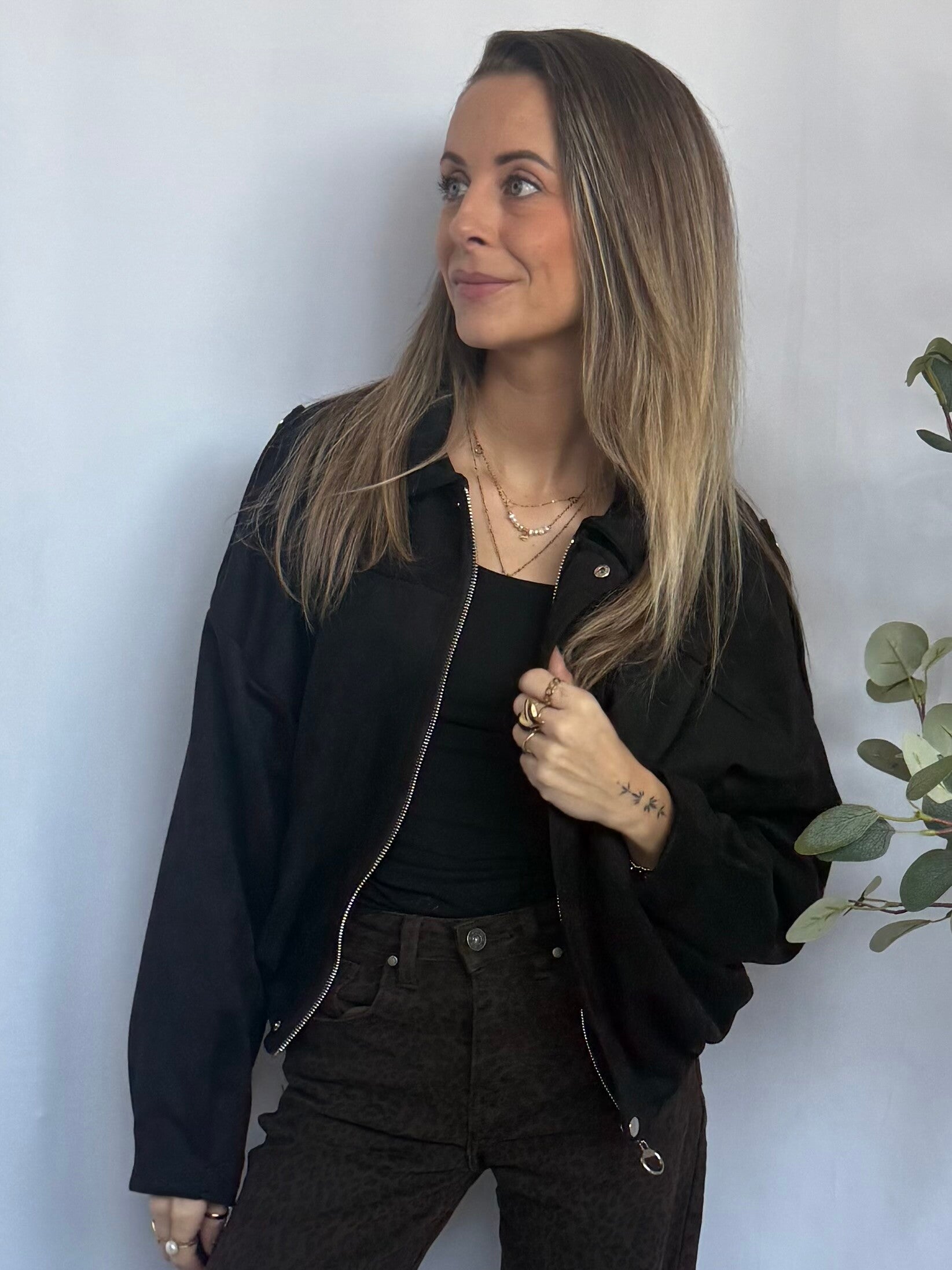 Een stijlvol jasje van zachte suèdelook met een korte, licht oversized pasvorm. De binnenzijde is gevoerd voor extra draagcomfort, en de elastische zoom zorgt voor een mooie aansluiting. Perfect als tussenjasje of om je outfit een stoere twist te geven.