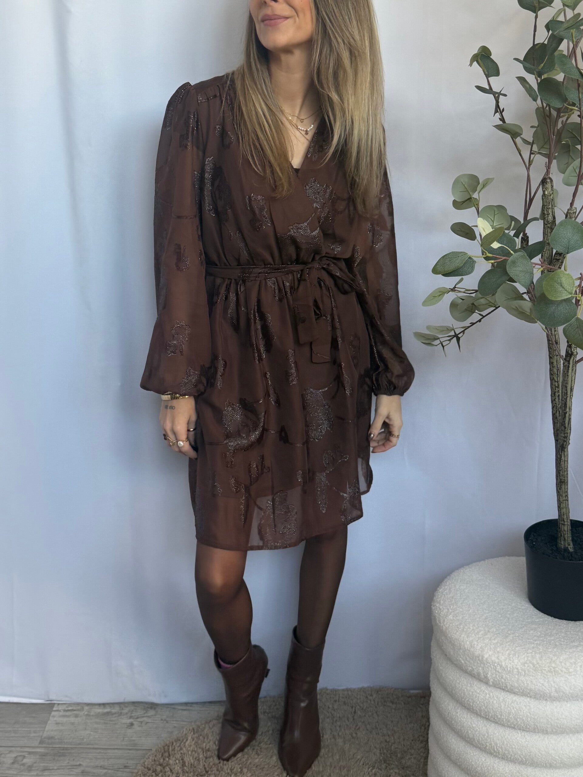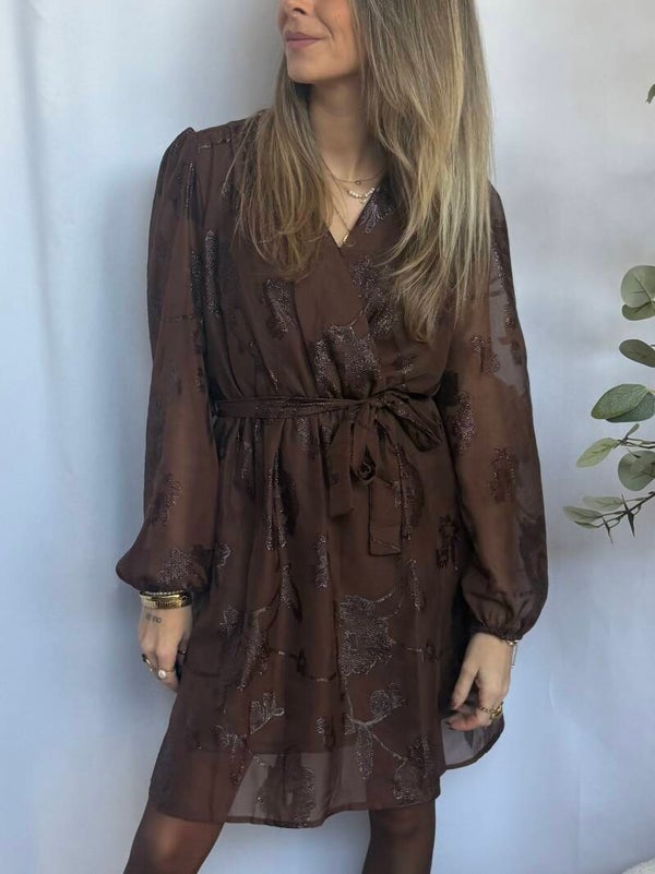 Elegante jurk met een subtiele glans en ingeweven bloemmotief. De wikkelvormige top en elastische taille zorgen voor een mooie, vrouwelijke pasvorm. De stof valt soepel en heeft een lichte glinstering die de jurk perfect maakt voor feestelijke gelegenheden of een chique avondje uit.