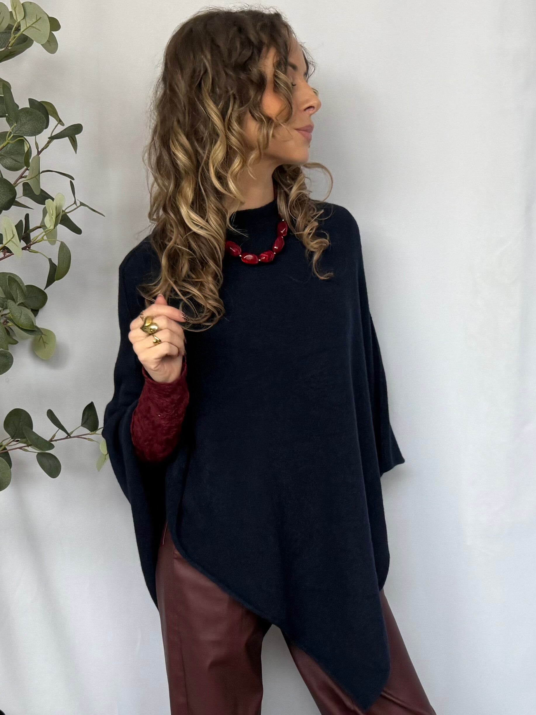 Deze zachte poncho valt soepel en heeft een elegante asymmetrische vorm die elke outfit meteen een stijlvolle, cozy touch geeft. De stof voelt warm maar licht aan, draagt comfortabel en is ideaal om over elke top of blouse te stylen. Perfect voor herfst- en winterlooks of als extra laagje voor een luxe finishing touch.