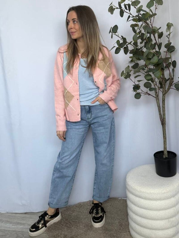 Dit zachte gebreide vest heeft een speels ruitpatroon in zachte tinten en een comfortabele, losvallende pasvorm. Het vest sluit met knopen aan de voorzijde en is makkelijk te combineren met zowel een top als een blouse. Perfect voor een extra laagje, het hele seizoen door.