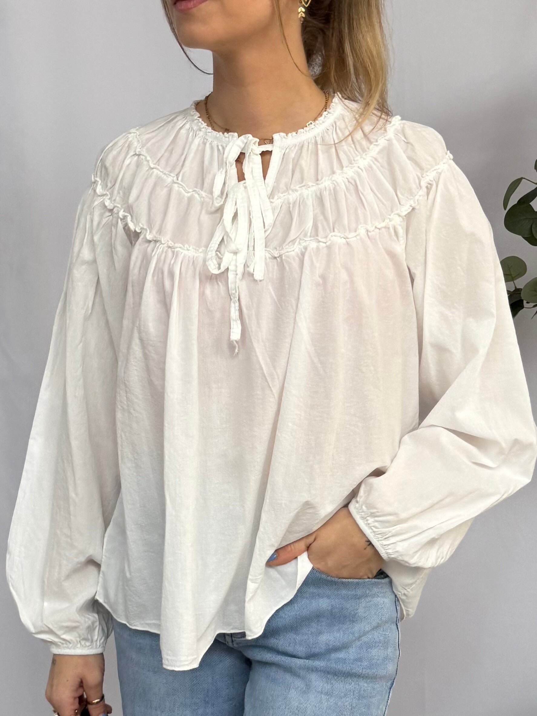 Deze luchtige blouse heeft een zachte, natuurlijke uitstraling en draagt heerlijk comfortabel. De halslijn met strikdetail en de subtiele rimpelingen geven de blouse een vrouwelijke, nonchalante look.