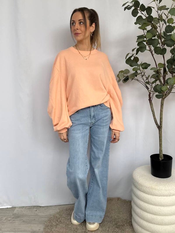Deze katoenen sweater heeft een oversized pasvorm met balloon mouwen en voelt heerlijk zacht aan. Door de luchtige structuur is hij ideaal voor elke dag en makkelijk te combineren met zowel een jeans als een rok. De frisse kleuren geven de sweater een rustige, moderne uitstraling.