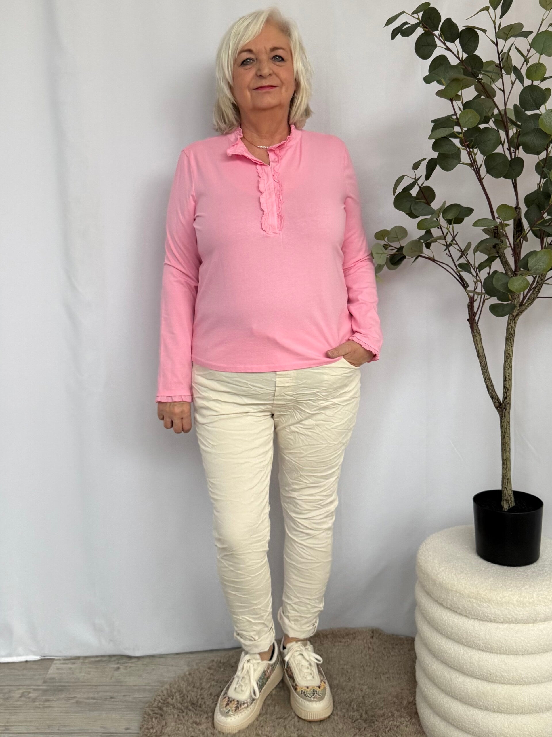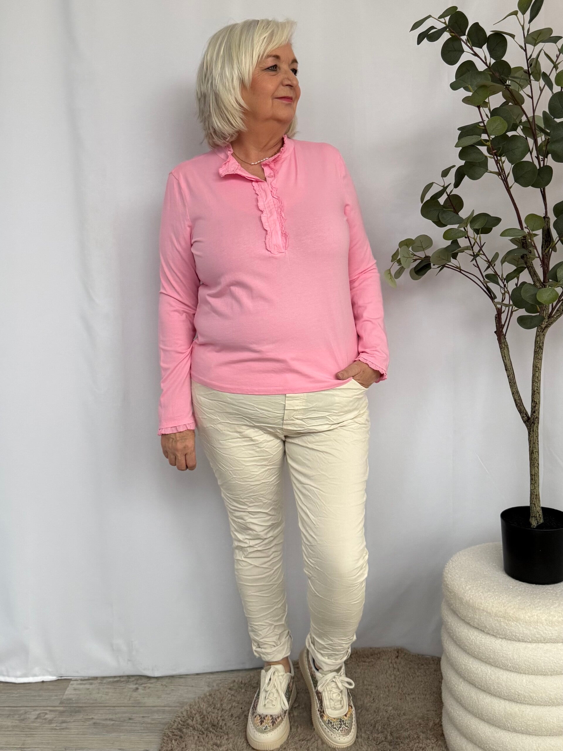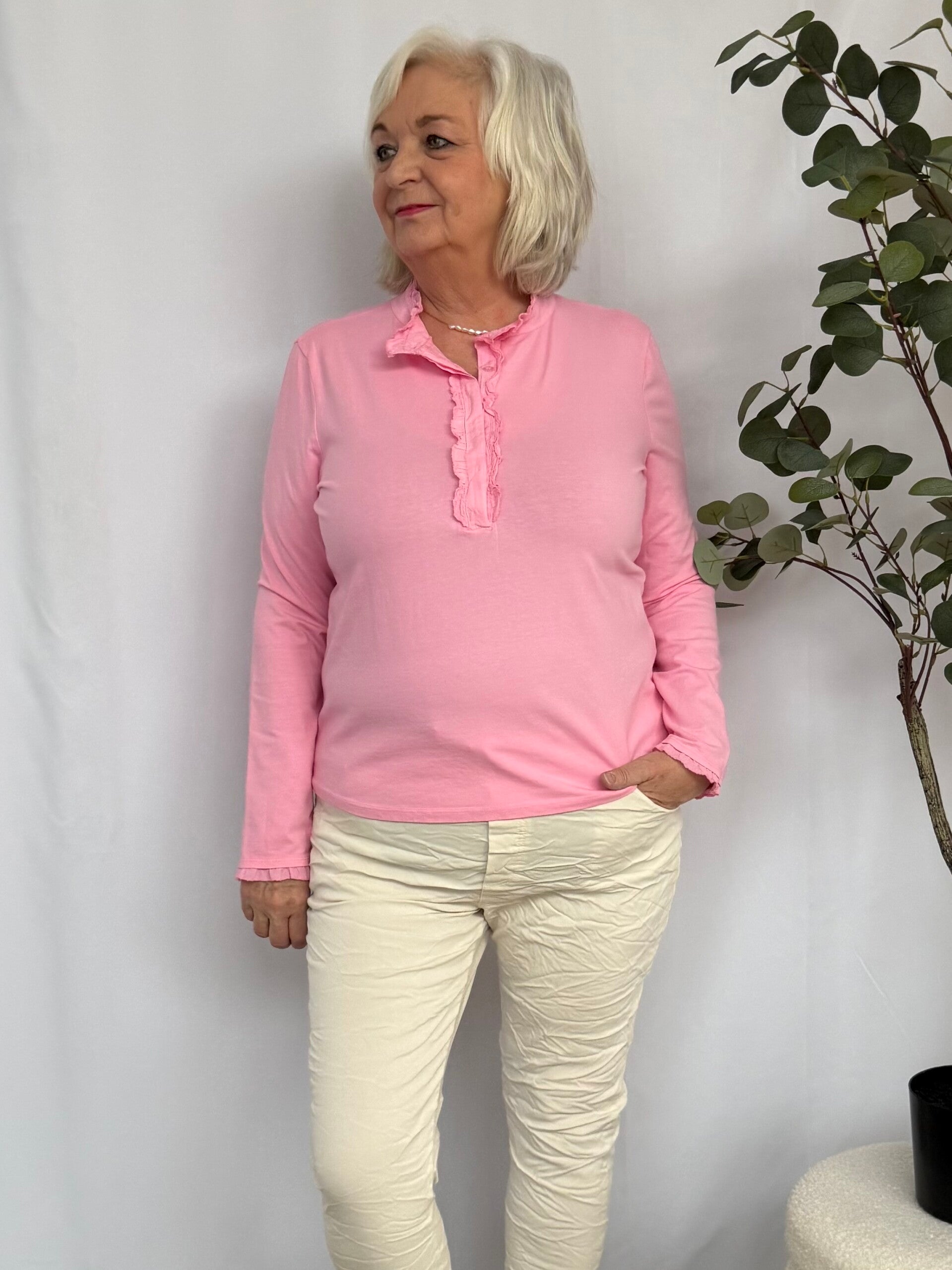 Deze lichtblauwe top is een fijne basic met nét dat beetje extra. De subtiele ruffle langs de hals en de speelse afwerking bij de halslijn geven de top een zachte, vrouwelijke uitstraling. Ideaal om zo te dragen, maar ook perfect als laagje onder een vest of blazer.
