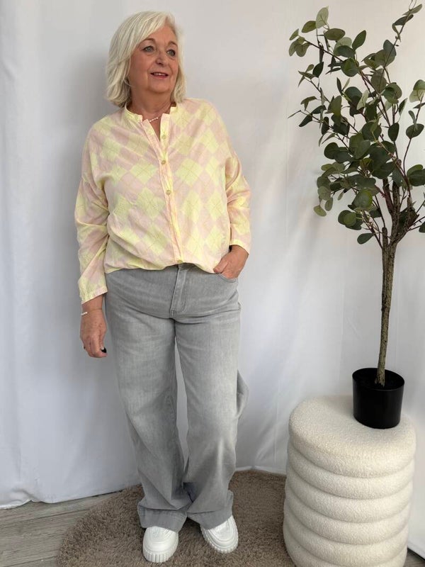 Blouse: Patroon Geel/Roze