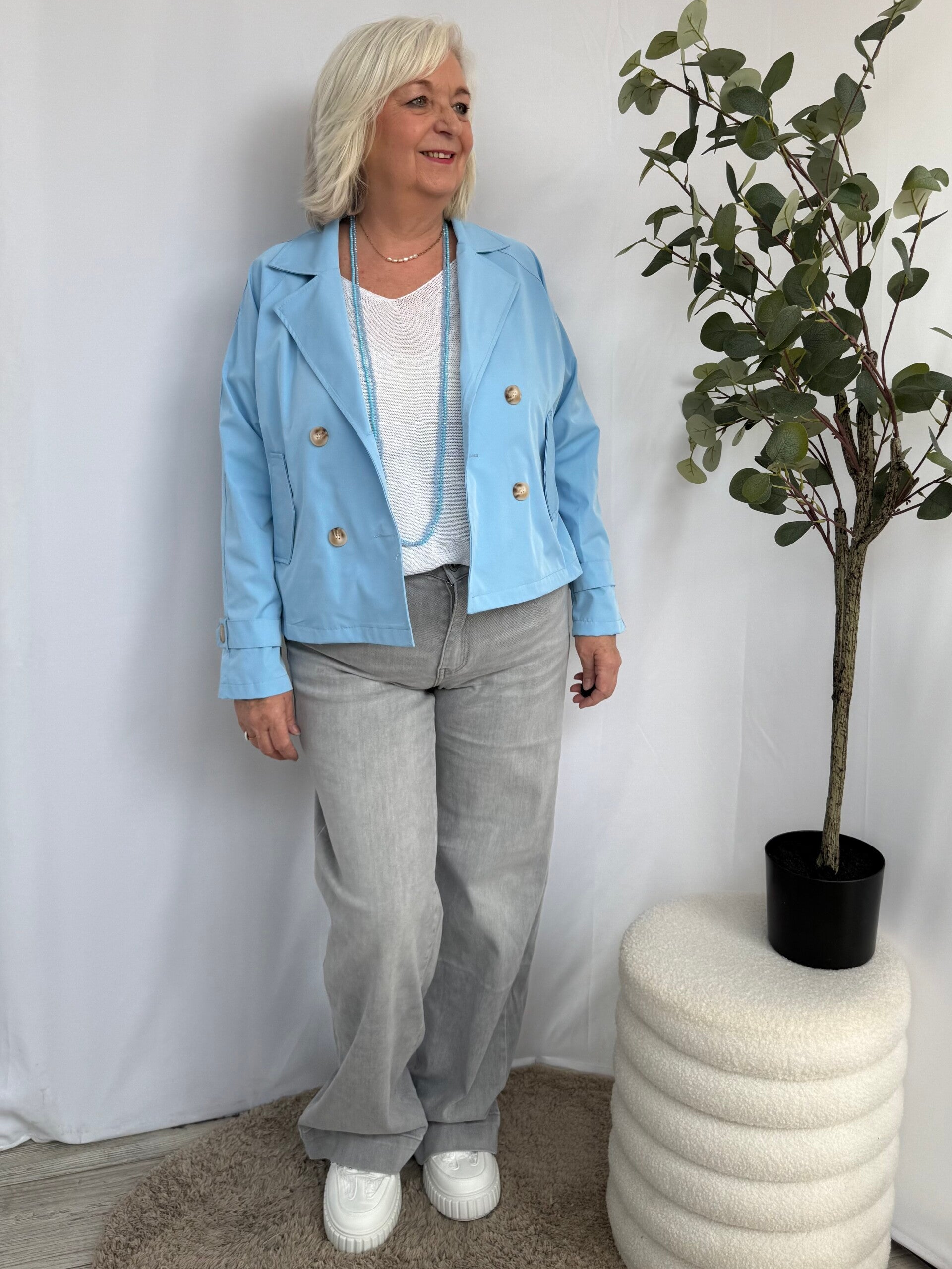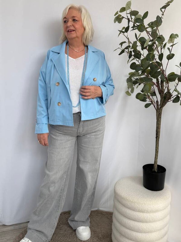 Deze korte trenchcoat geeft je outfit direct een stijlvolle en moderne uitstraling. Het tijdloze model met reverskraag en knoopsluiting maakt dit jasje makkelijk te combineren, terwijl de cropped lengte zorgt voor een speels en eigentijds effect.