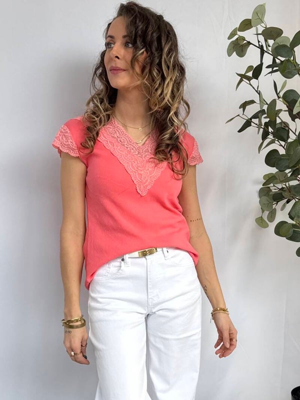 T-shirt: Kant Rib V-hals Koraal