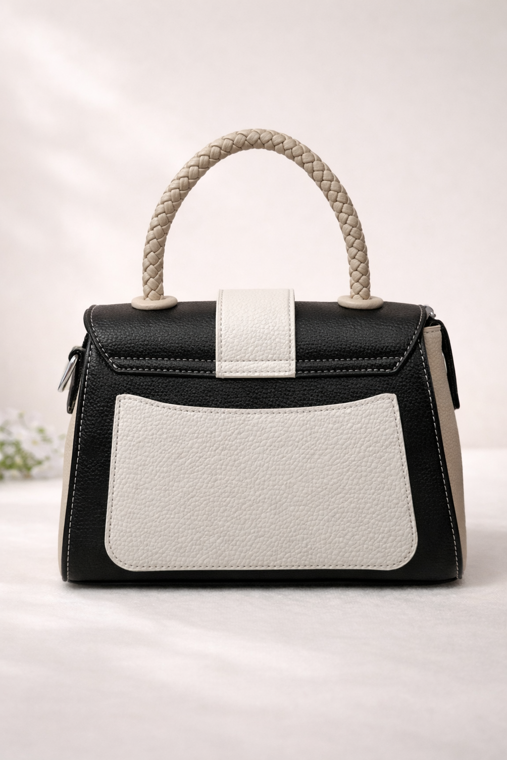 Deze elegante handtas combineert zwart met beige tinten voor een rustige, stijlvolle uitstraling. Het gevlochten handvat geeft de tas een luxe detail en maakt hem perfect voor zowel dagelijks gebruik als een nette outfit.