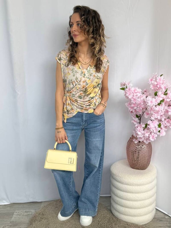 Deze top geeft meteen een vrouwelijke en zomerse uitstraling. De zachte bloemenprint en het speelse overslagdetail en strik aan de voorkant zorgen voor een flatterend effect. De stof valt soepel langs het lichaam en maakt de top perfect om te combineren met een jeans, rok of lichte pantalon voor een frisse en stijlvolle look.