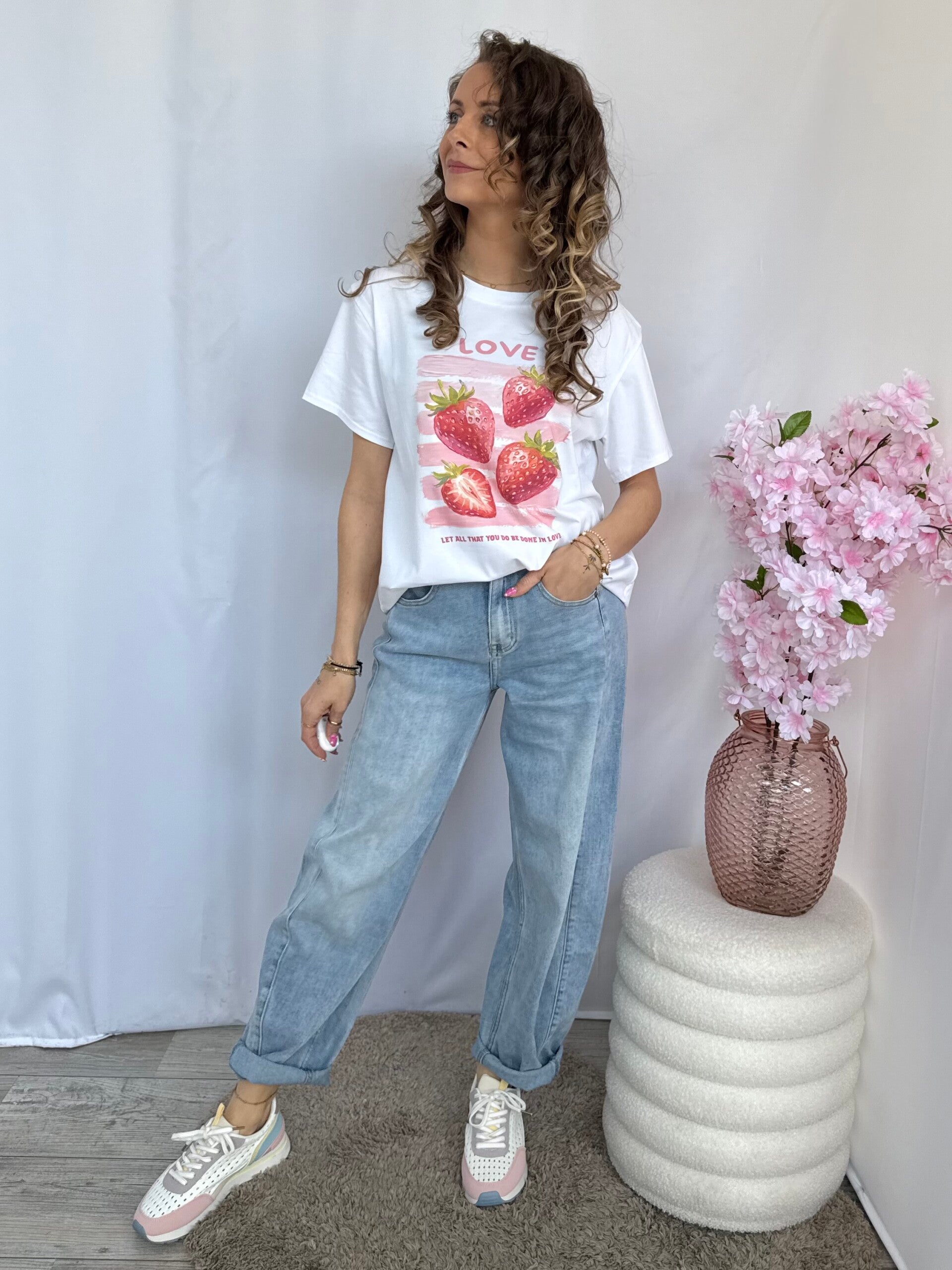 Een wit T-shirt met aardbeienprint en zachte roze details. Een vrolijk item met zomerse uitstraling dat elke outfit opfrist. Leuk voor iedere dag.