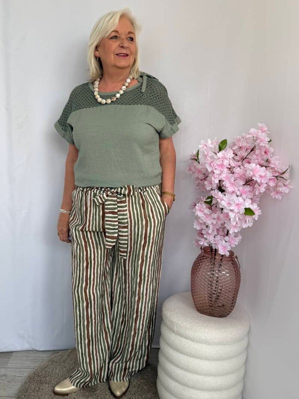 Een luchtige en stijlvolle broek met speelse verticale strepen in olive, wit en bruintinten. De elastische tailleband met strikceintuur zorgt voor extra comfort en een mooie pasvorm. Perfect te combineren met een basic top, blouse of matching item.